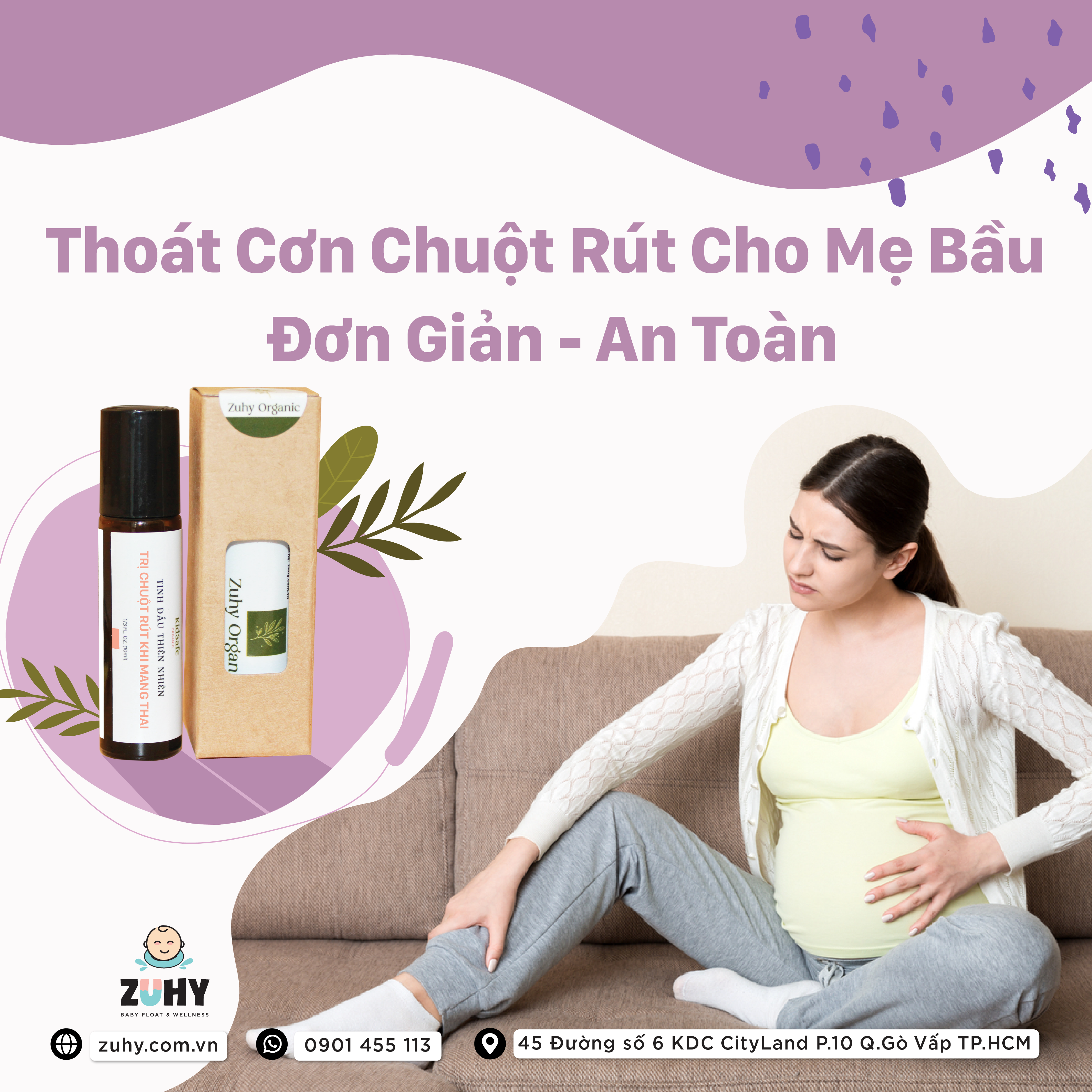 4. Ngoài ra, Zuhy Organic giới thiệu đến các mẹ bầu giải pháp massage tinh dầu làm tiêu biến triệu chứng chuột rút cực kỳ hiệu quả. Chỉ cần lấy một lượng vừa đủ massage những vùng hay bị chuột rút, mẹ bầu sẽ thấy thoải mái mà lại an toàn.